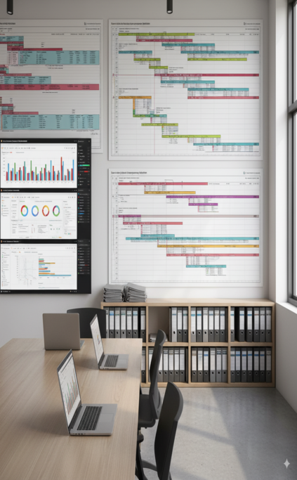 Stage-gates, reporting cadence, and change control mechanisms ensure structured governance throughout the project.